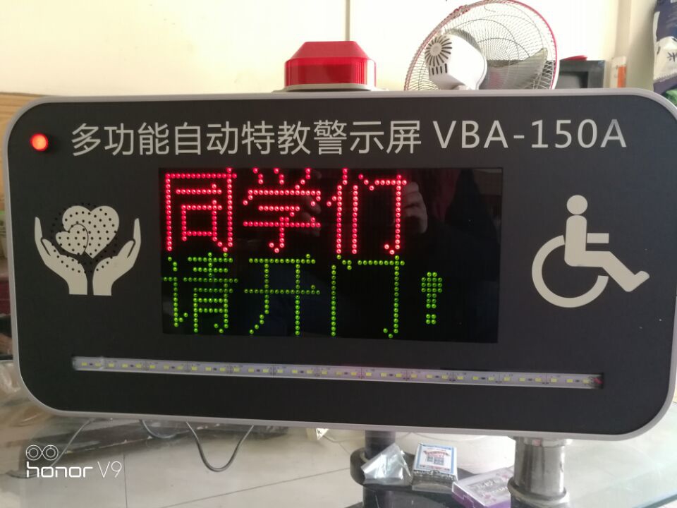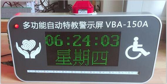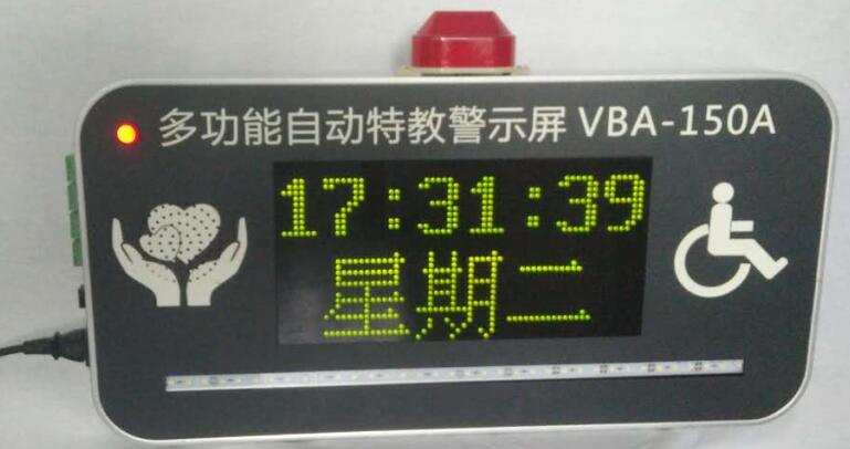 本装置按控制主机发出的信号要求,在显示屏上显示出“起床,早餐,上课、下课”、午休,晚自息,“火速离开”和“开门”等字幕,多功能高速唤醒振动器准时上、下课提醒、声光同步及时提醒学生注意,并具有彩光、省电、使用寿命长和字迹清晰等特点,特别适合于特殊教育学校的学生使用。