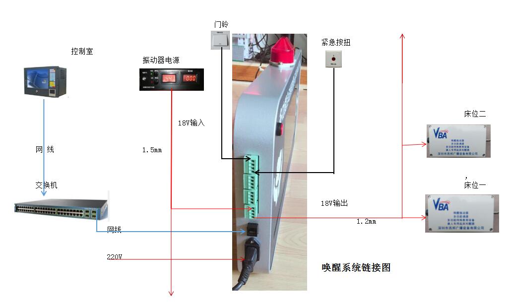 为了确保聋生在夜间睡眠中也能够控制室发出的起床信号,不因夜间沉睡而耽误,在信号传达的同时,启动每个床铺下的强震器振动,振动器可以调节振动力度的大小,促使聋生苏醒。日常兼作早晨或午休时的定时起床唤醒,免去校方打钟的不便和聋生沉睡不起的麻烦。